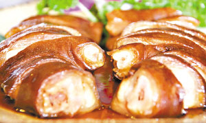 潤口的普洱茶豬手,入口就能品嘗到普洱茶的陳香味。秀色的豬手就像普洱茶一樣經(jīng)歷了歲月的考驗(yàn),口感比較特別,肥而不膩、外表富有彈性而里面則嫩滑、清爽。