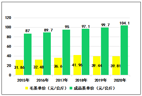 圖6   2015-2020年云南毛茶、成品茶單價(jià)對比圖