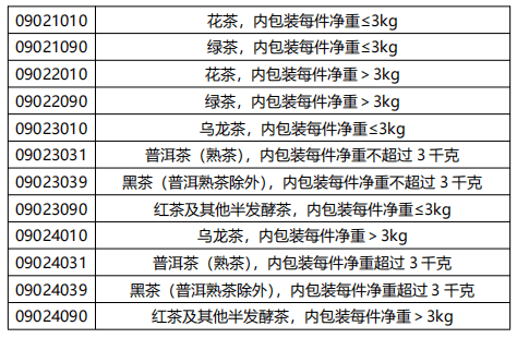 2020年12月,國務院關稅稅則委員會對茶葉類進出口稅號進行了調(diào)整,新增黑茶出口稅號類目,調(diào)整后茶葉進出口商品編碼及商品名稱信息如下: