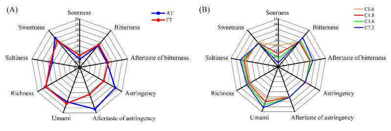兒茶素,尤其是表沒食子兒茶素沒食子酸酯(EGCG)和表兒茶素沒食子酸酯(ECG)是茶葉苦澀味的最主要來源。秋茶經(jīng)冠突散囊菌PW-1發(fā)酵后,兒茶素總量從118.35 mg/g下降到10.58 mg/g,下降幅度達(dá) 91.06%;且發(fā)酵秋茶中酯化兒茶素EGCG和ECG的含量分別為0.37 mg/g和0.40 mg/g,表明菌株P(guān)W-1發(fā)酵可顯著降低秋茶中的兒茶素含量。通過電子舌技術(shù)對(duì)秋茶和冠突散囊菌PW-1發(fā)酵秋茶的滋味特征進(jìn)行分析,發(fā)現(xiàn)秋茶的澀味顯著降低而鮮味強(qiáng)度有所增加,表明秋茶經(jīng)菌株P(guān)W-1發(fā)酵后的滋味品質(zhì)得到顯著提高。此外,通過電子舌技術(shù)首次對(duì)茶褐素的滋味特征進(jìn)行分析,發(fā)現(xiàn)茶褐素?zé)o澀味而呈強(qiáng)烈的鮮味,為發(fā)酵秋茶中的主要呈味物質(zhì)。