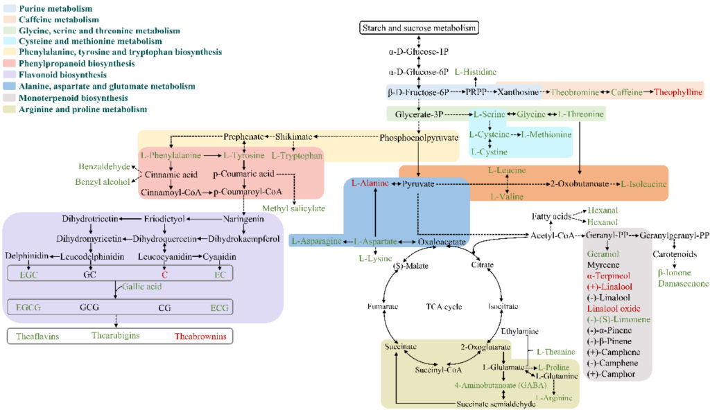 GC-MS分析結(jié)果顯示,秋茶中醇類揮發(fā)性成分的含量在冠突散囊菌PW-1發(fā)酵后顯著增加,其中呈花果香味的(Z)-芳樟醇氧化物、芳樟醇、(E)-芳樟醇氧化物(呋喃型)和 1-辛烯-3-醇的含量最高,表明菌株P(guān)W-1顯著提升了秋茶的香氣品質(zhì)。代謝途徑分析結(jié)果顯示,冠突散囊菌PW-1提升秋茶品質(zhì)主要與丙氨酸、天冬氨酸和谷氨酸代謝途徑,甘氨酸、絲氨酸和蘇氨酸代謝途徑,氨酰-tRNA 生物合成途徑,精氨酸生物合成途徑以及精氨酸和脯氨酸代謝途徑的表達(dá)相關(guān)。