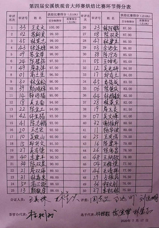 據(jù)主辦方介紹,今年舉辦的第四屆安溪鐵觀音大師賽延續(xù)了前三屆大師賽的賽制規(guī)則。根據(jù)規(guī)則,烘焙比賽要求選手必須在規(guī)定的8個小時內(nèi)用烘焙組委會統(tǒng)一提供的毛凈茶和烘焙機械,獨立完成烘焙。7月17日下午,本次烘焙比賽茶葉評審組四位評委對50位選手的烘焙茶樣進行質(zhì)量審評,按質(zhì)量高低排定名次。經(jīng)過四小時的認真審評,第四屆安溪鐵觀音大師賽烘焙比賽環(huán)節(jié)得分表出爐。